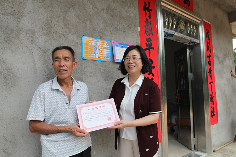 图为市政协副主席林雪梅(右一)走访帮扶贫困户,并为2017年脱贫的贫困户颁发脱贫荣誉书。潘玉山 摄