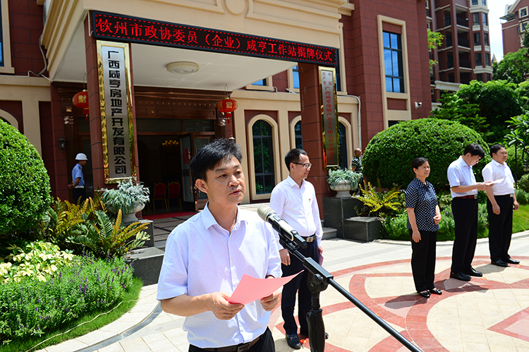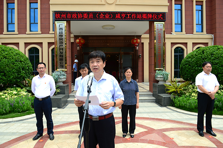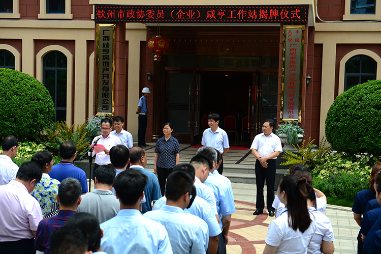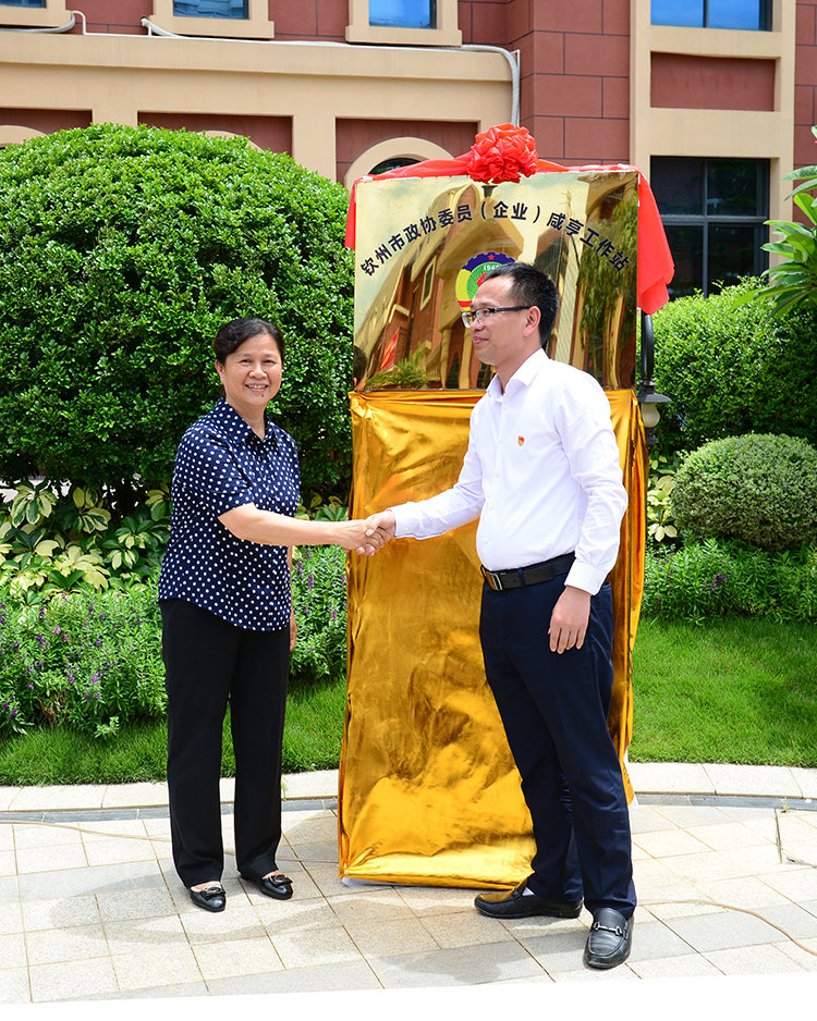 6月7日,钦州市政协委员(企业)咸亨工作站揭牌成立。图为市政协主席黄若萍(左)与市政协常委、广西咸亨房地产开发有限公司董事长郑卫康(右)共同为工作站揭牌。