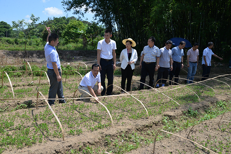 图为市政协副主席陆崇友(左二)到罗家村中草药种植基地育苗场实地考察。陈国明 摄
